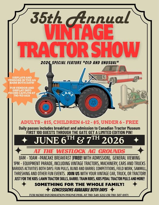 The 35th Annual Vintage Tractor Show will take place on June 6 and 7, 2026, at the Westlock Ag Grounds, offering a full weekend of activities celebrating vintage equipment and rural heritage.