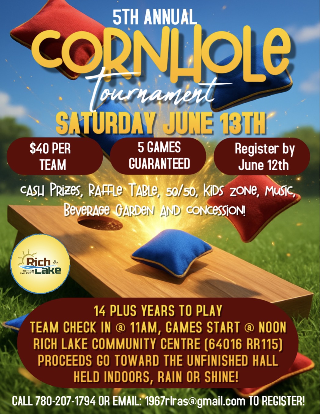 The Rich Lake Agricultural Society is gearing up for their 5th Annual Cornhole Tournament, taking place on Saturday, June 13th at the Rich Lake Community Centre.