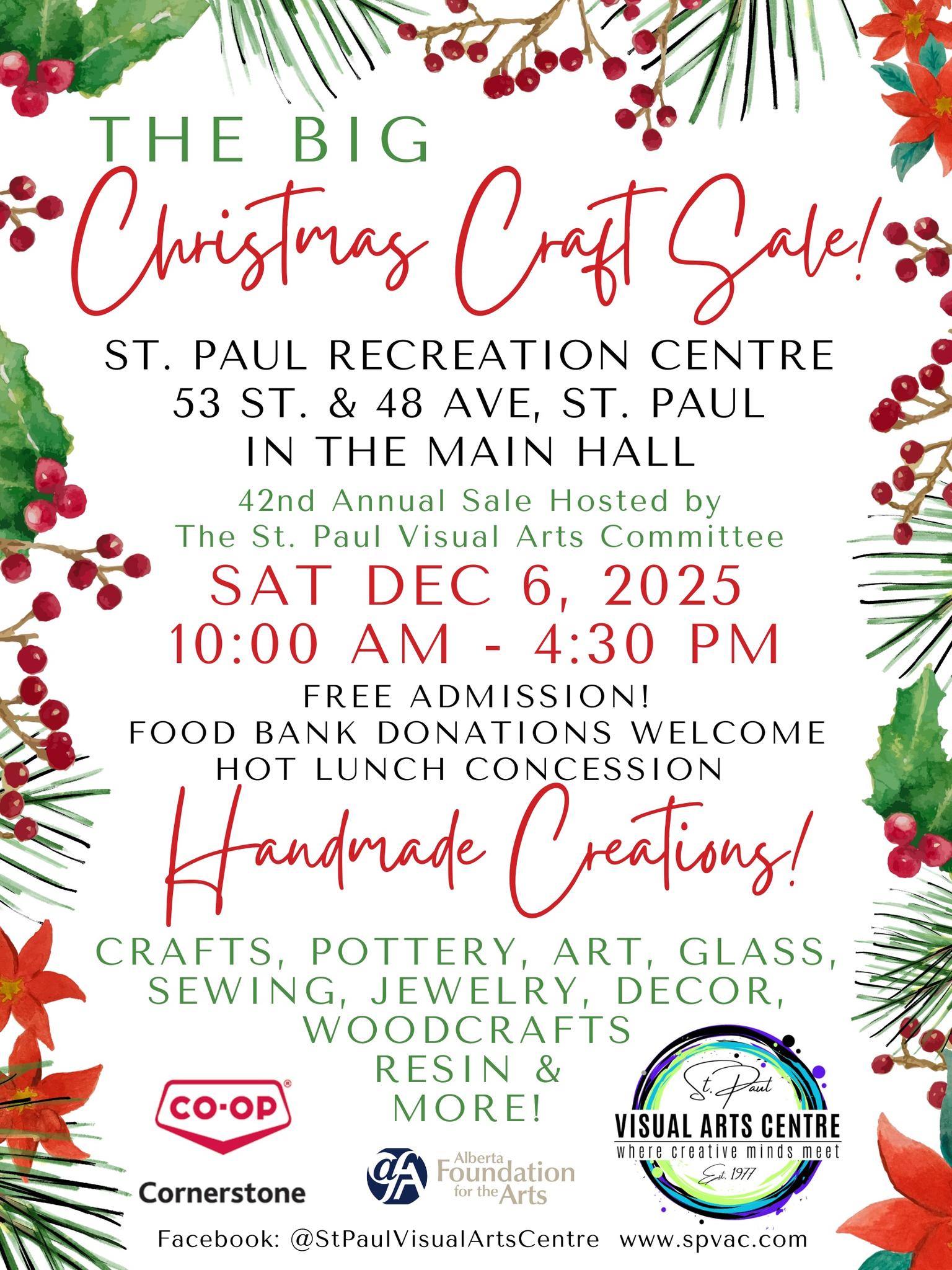 Date Dec 06 2025 Time 10:00 am - 4:30 pm Community Events Christmas Craft Sale in St. Paul Share this event + Add to Google Calendar + iCal / Outlook export Location St. Paul Recreation Centre Labels Community Event Locations St. Paul Recreation Centre Share this event