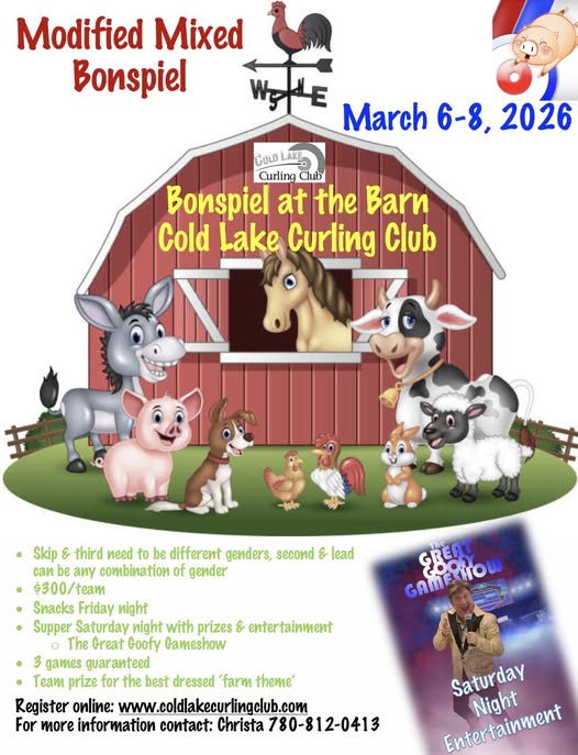 The Cold Lake Curling Club is hosting its Modified Mixed Bonspiel from March 6–8, 2026, with a fun farm-themed twist at “the Barn.”