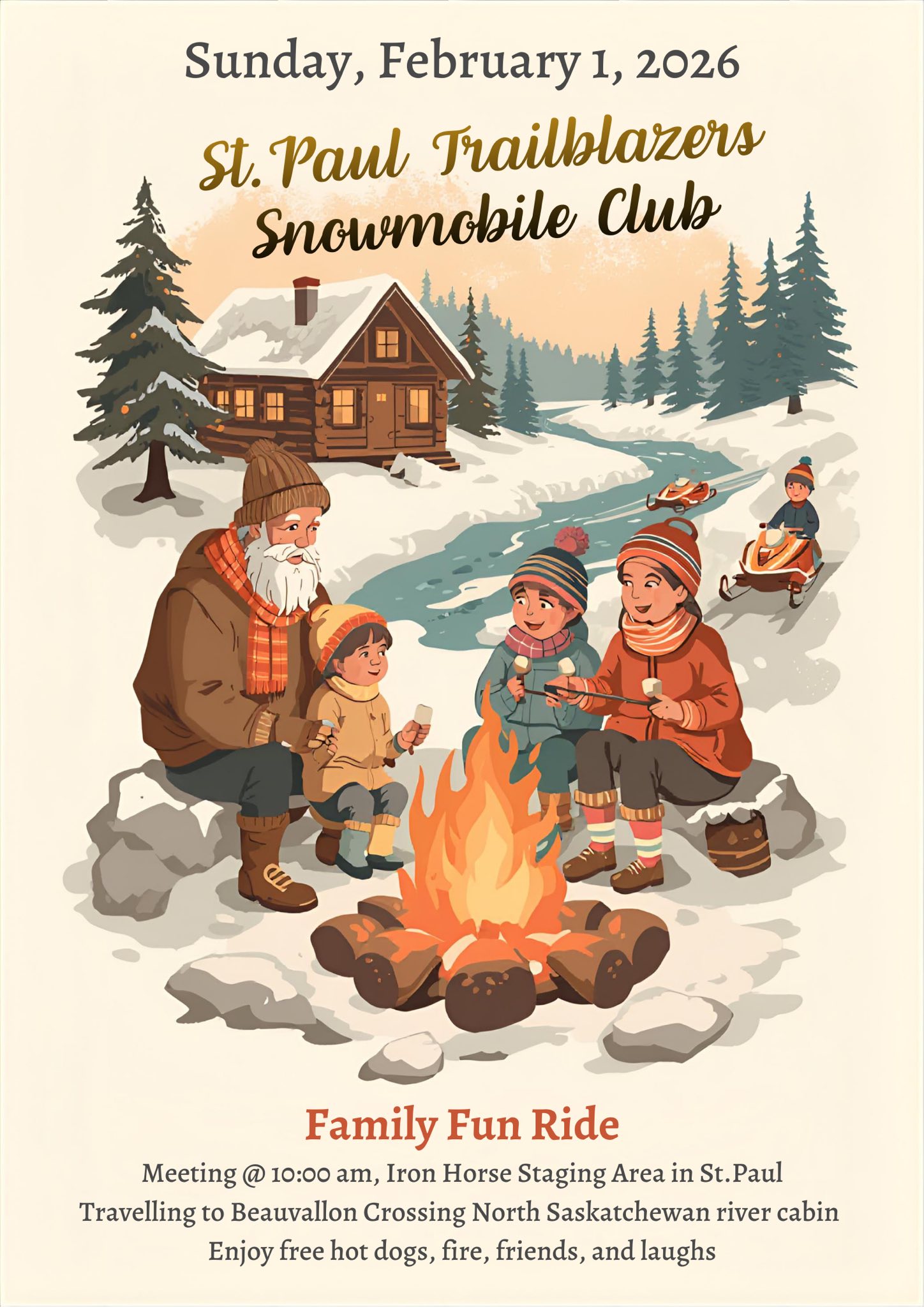 Riders will travel the snowmobile trail south to the Beauvillon River Cabin on the North Saskatchewan River.