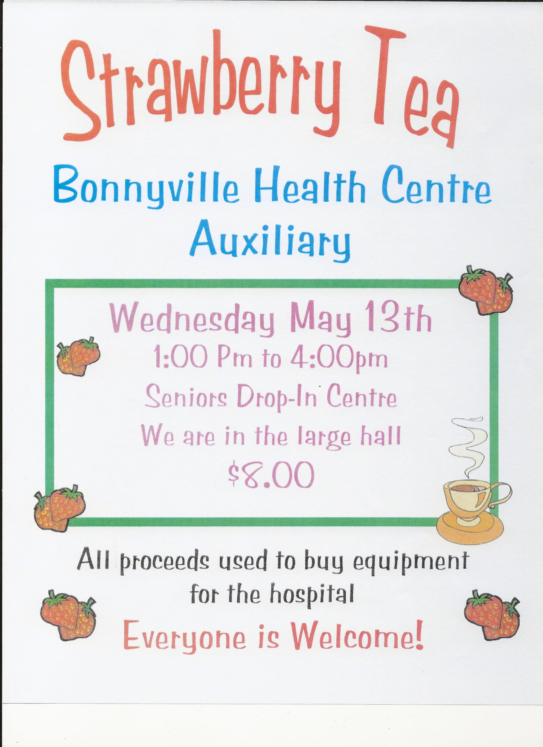 The Bonnyville Health Centre Auxiliary is hosting a Strawberry Tea on Wednesday, May 13th from 1:00 PM to 4:00 PM at the Seniors Drop-In Centre (large hall).