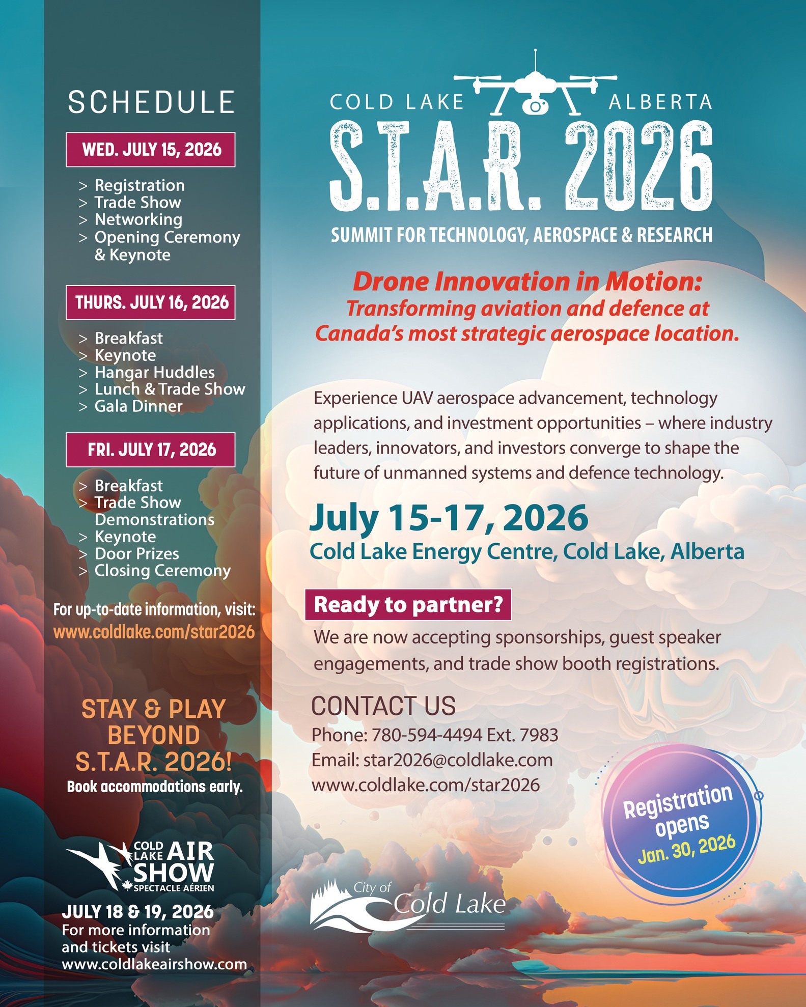 S.T.A.R. 2026 (Summit for Technology, Aerospace & Research) is coming to Cold Lake, Alberta, July 15–17, 2026 at the Cold Lake Energy Centre.