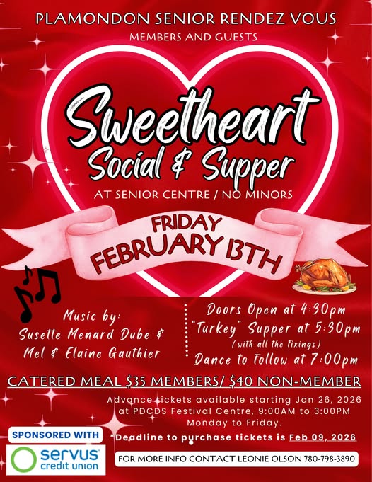 The Plamondon Senior Rendez Vous invites members and guests to attend the Sweetheart Social & Supper on Friday, February 13, 2026, at the Senior Centre. This event is open to adults only.