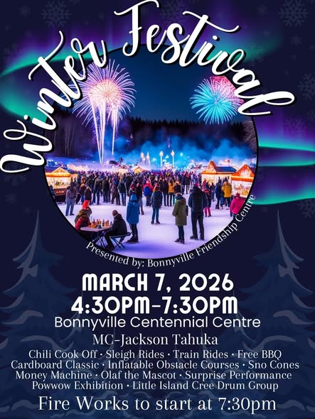 The Bonnyville Friendship Centre is hosting its Winter Festival on March 7, 2026, from 4:30 PM to 7:30 PM at the Bonnyville Centennial Centre, located at MC-Jackson Tahulua.